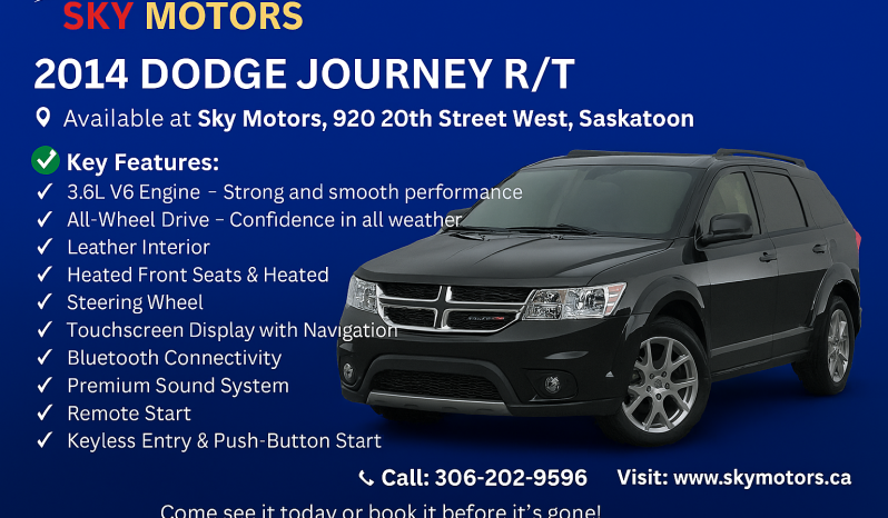 2014 Dodge Journey R/T – $[Your Price] Available at Sky Motors, 920 20th Street West, Saskatoon VIN- 3C4PDDFG4ET214580 *Clean Title *Financing Available *Extended Warranty Options *Trade-ins Welcome! ✅ Key Features: • V6 Engine – Strong and smooth performance • All-Wheel Drive – Confidence in all weather • Leather Interior • Heated Front Seats & Heated Steering Wheel • Touchscreen Display with Navigation • Bluetooth Connectivity • Premium Sound System • Remote Start • Keyless Entry & Push-Button Start • Alloy Wheels * Comes with Dashcam *Comes with sunroof Give me a call or text to know more: Call: 306-202-9596 Visit: www.skymotors.ca Email: skymotors94@gmail.com Come see it today or book it before it’s gone!